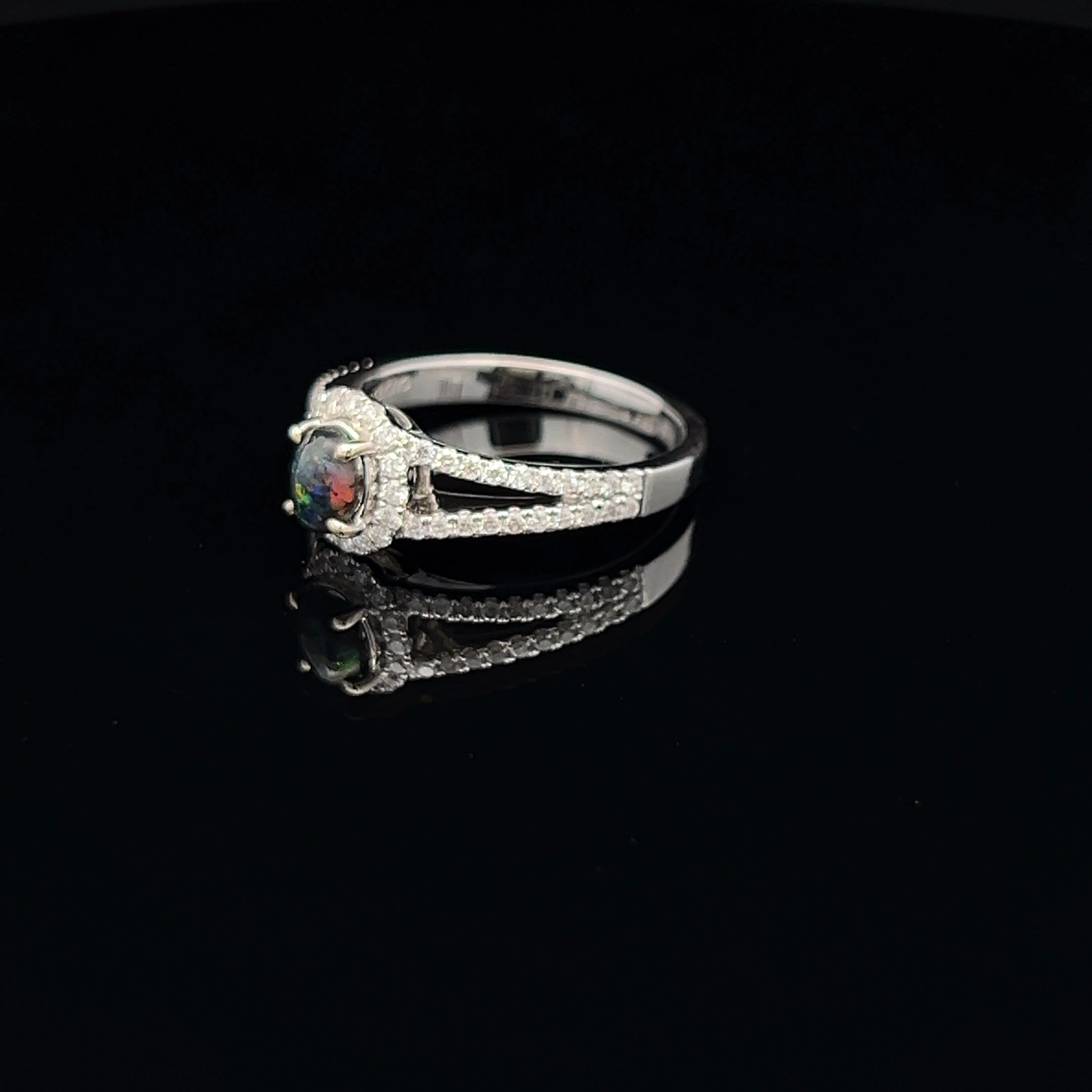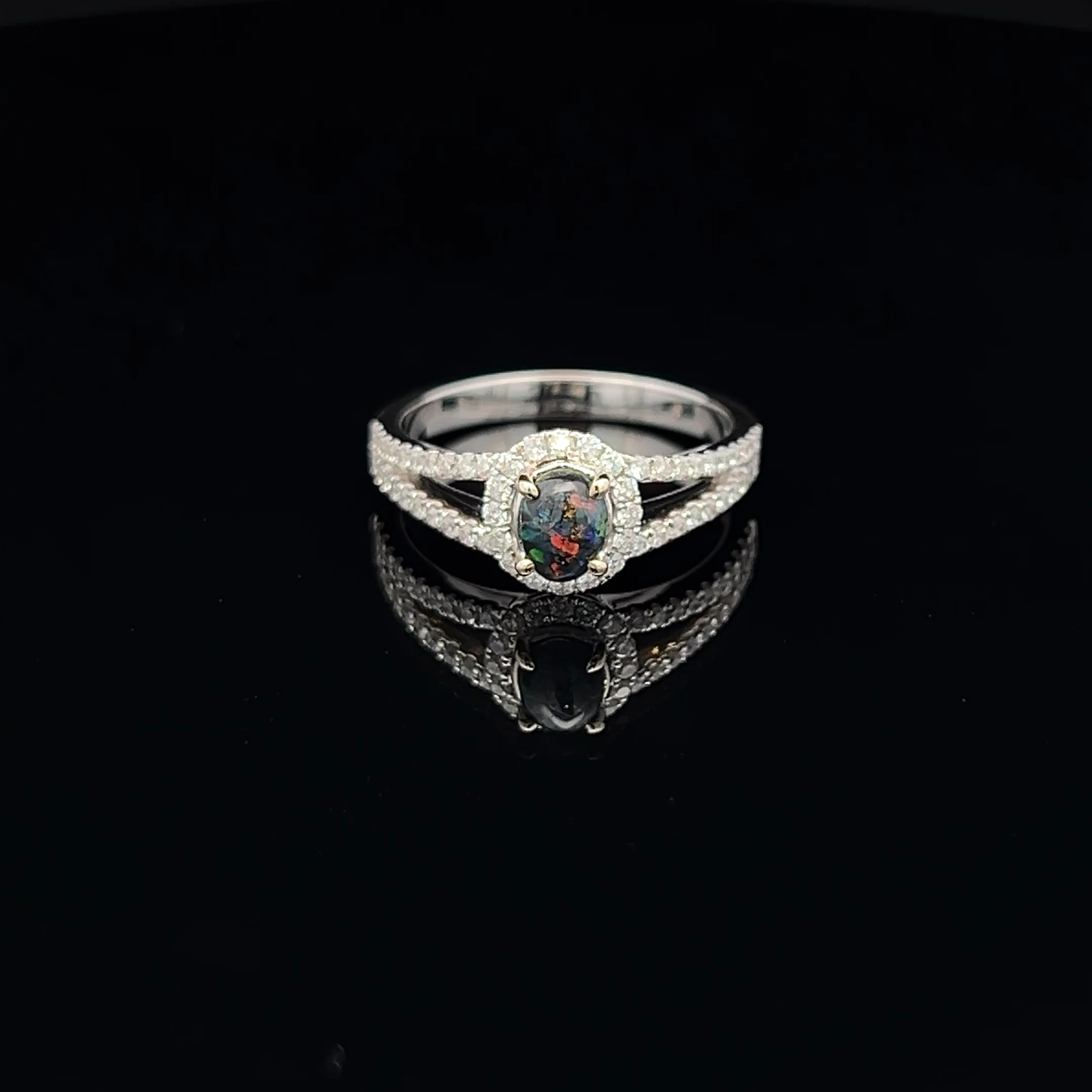 Solid Oval-Cut Black Opal with Diamond Halo set in an 18K White Gold Split-Band with Diamonds Half-Way Down