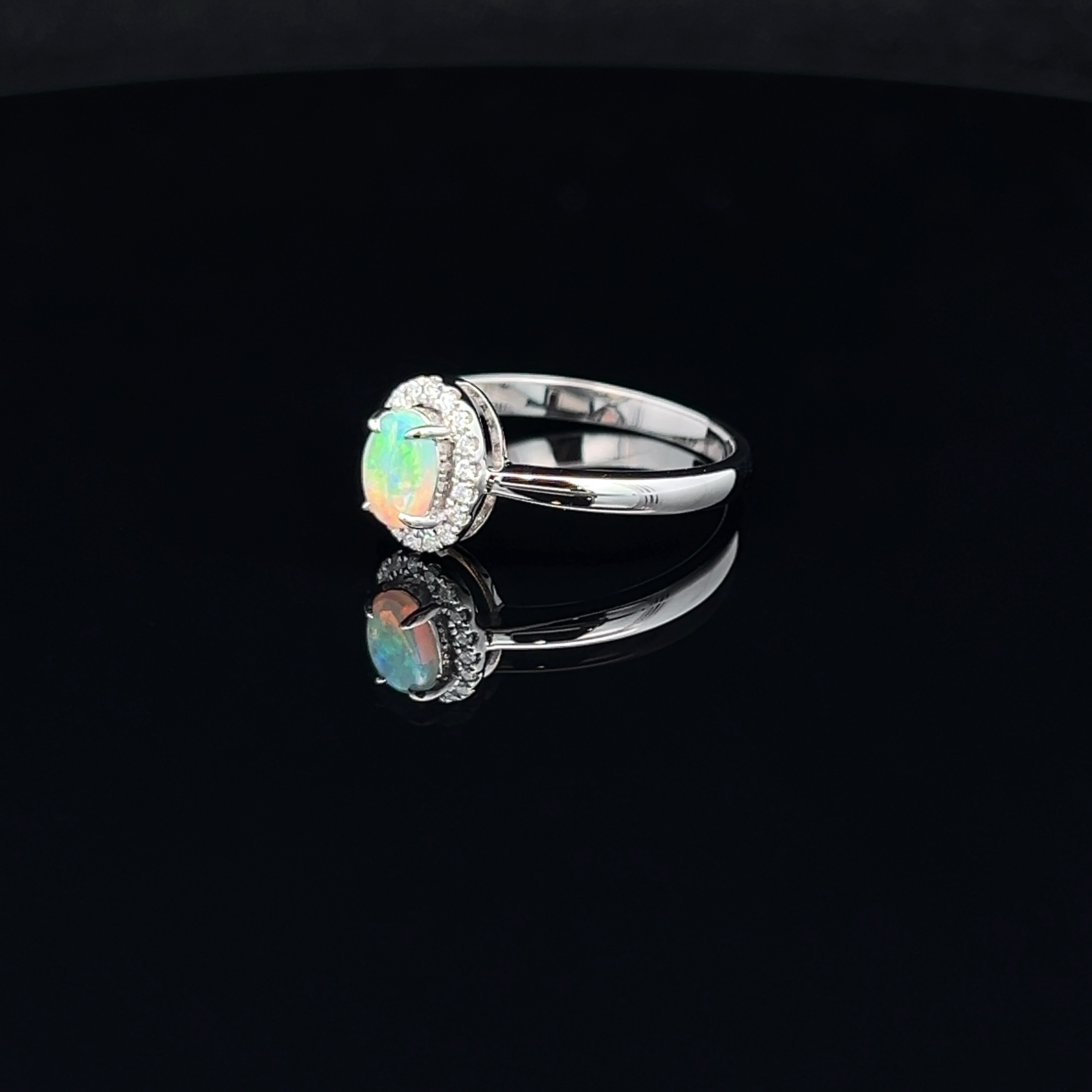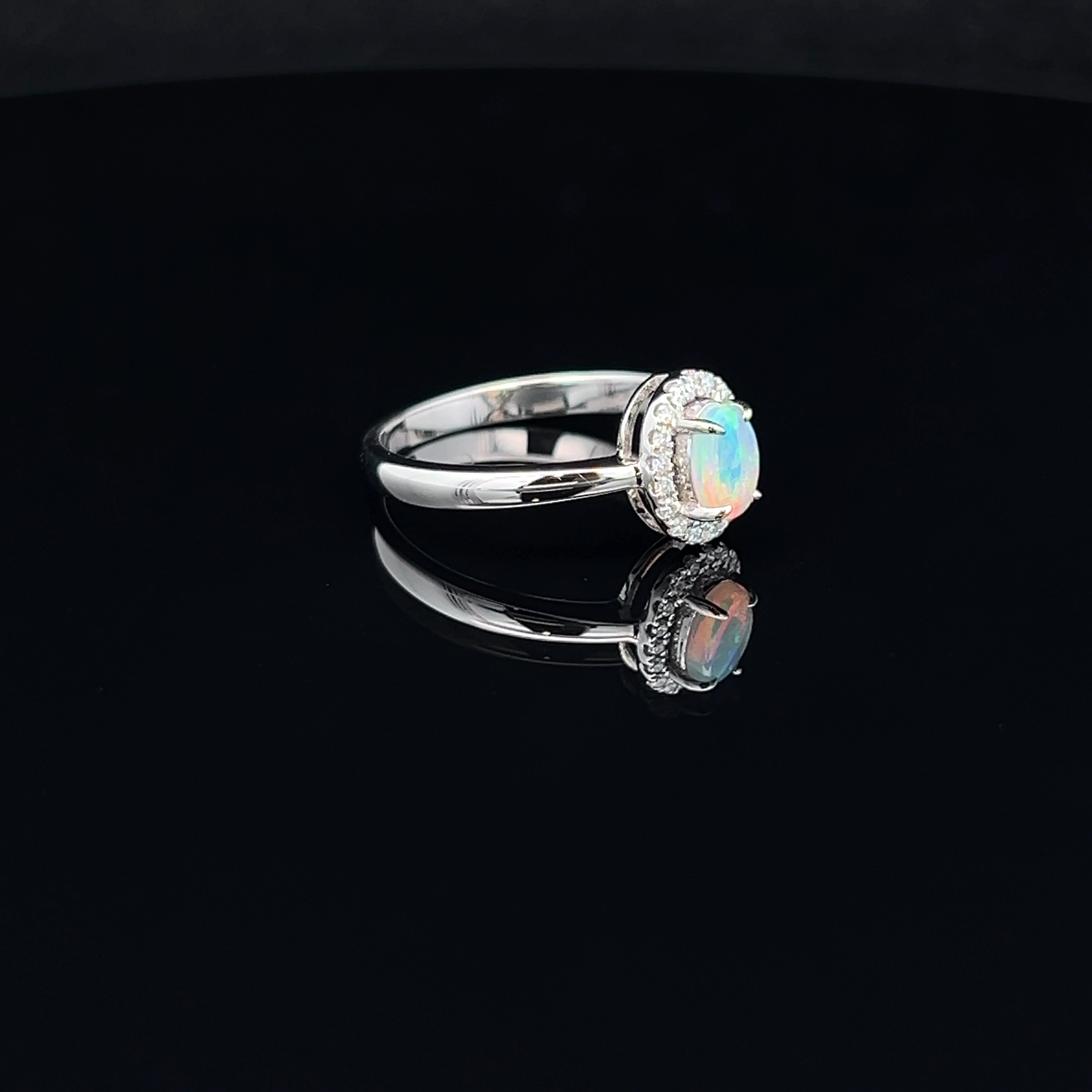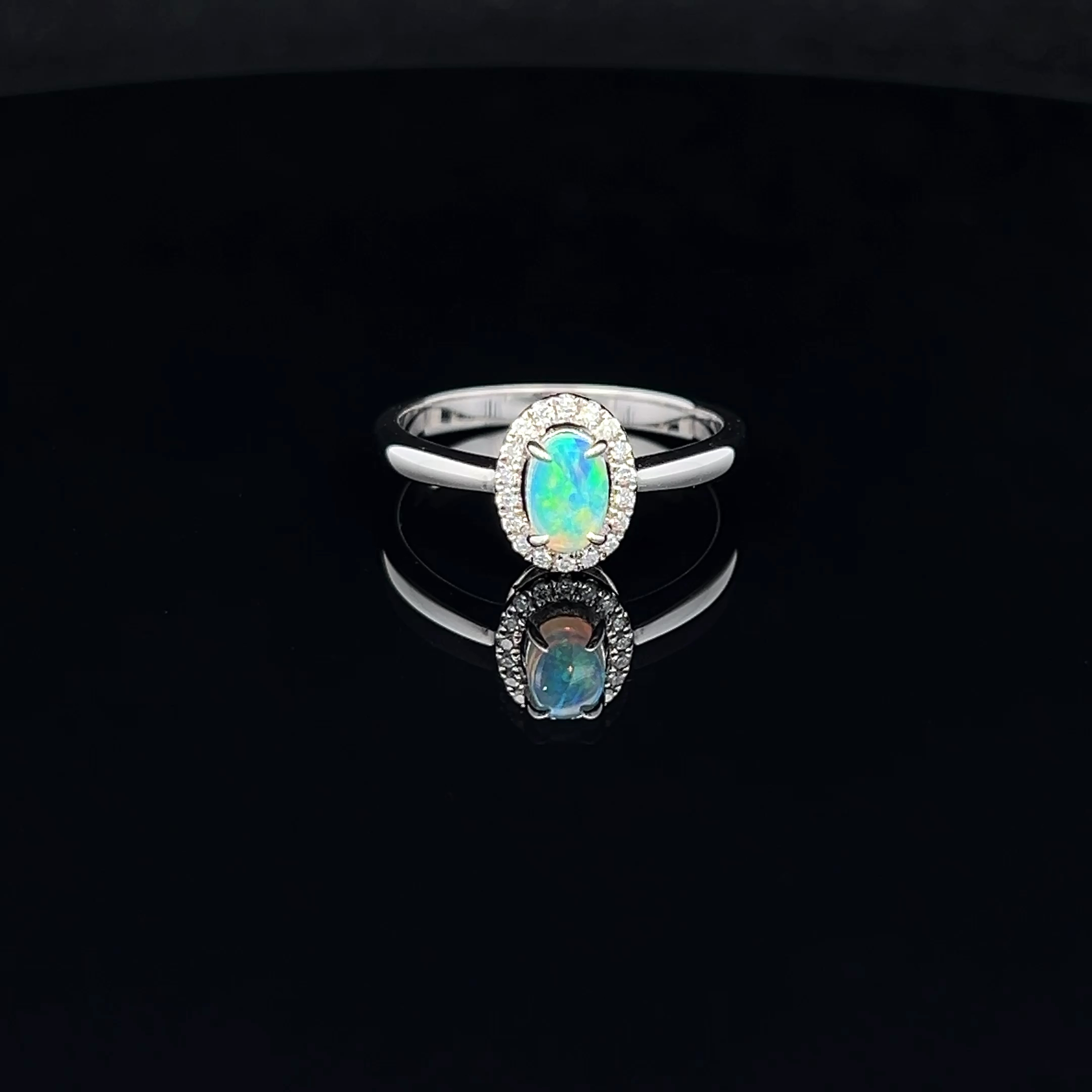 Coober Pedy Solid Crystal Opal & Halo Diamond Ring set in 18K White Gold