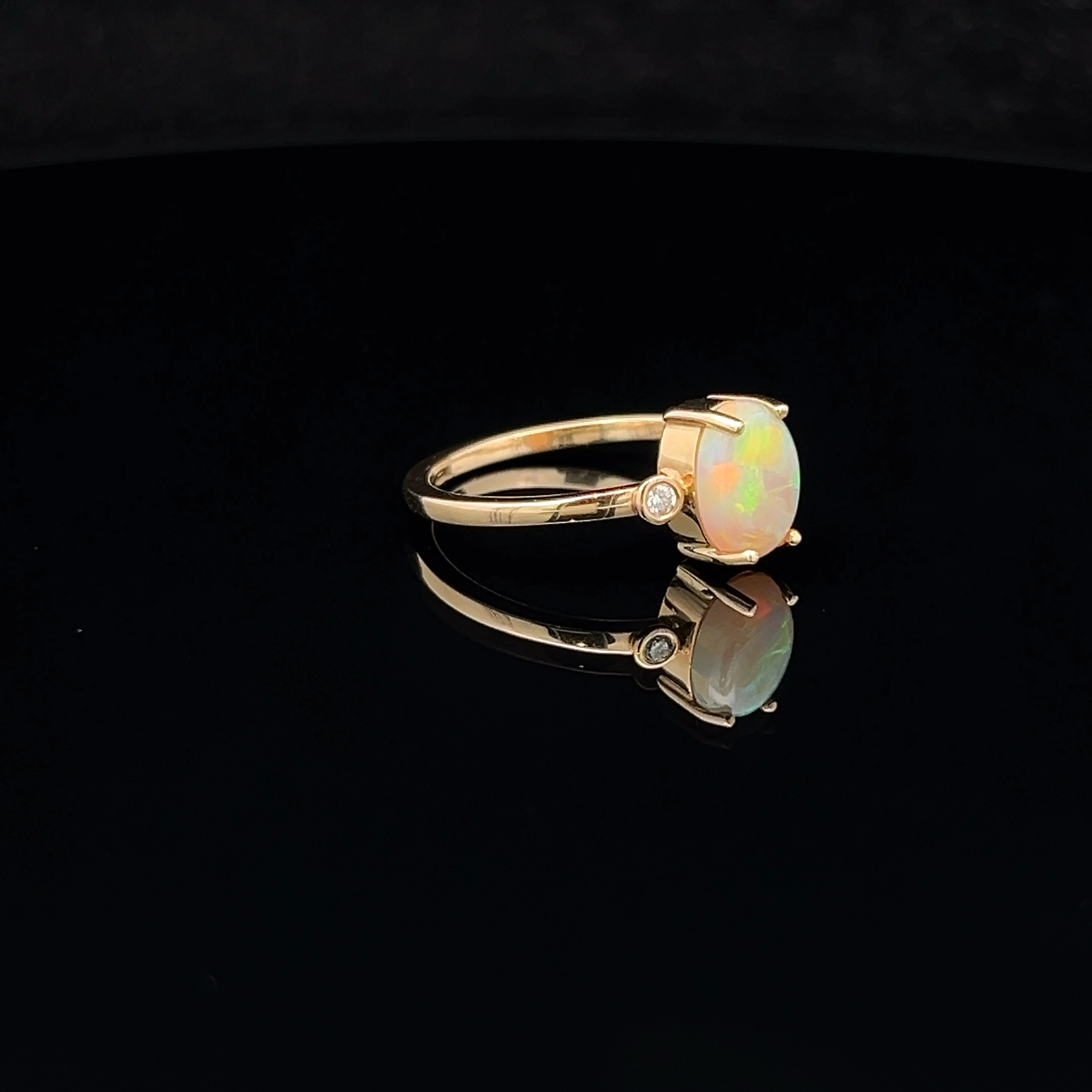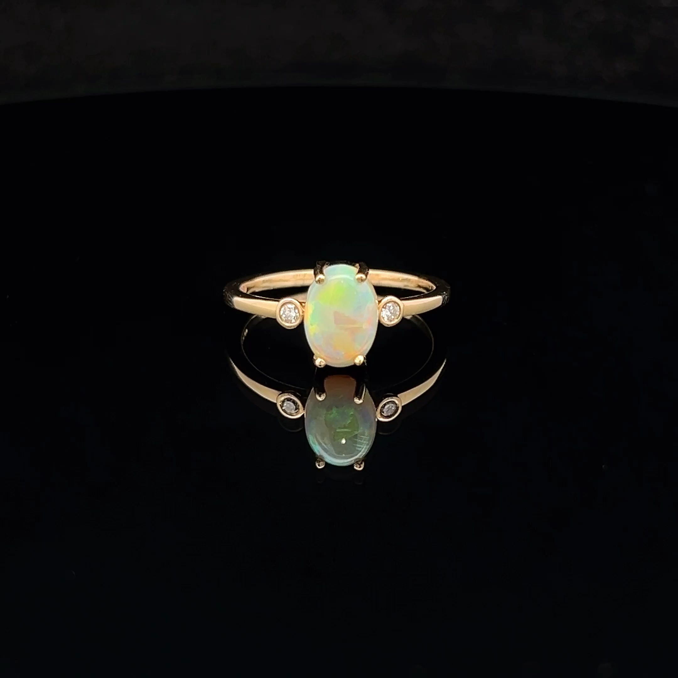 Solid Oval-cut Light Opal set in 18K Yellow Gold with a Diamond either side