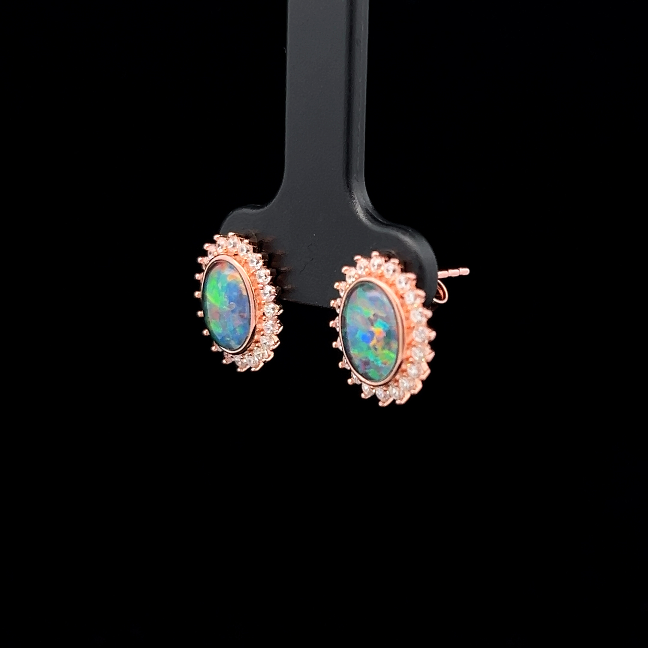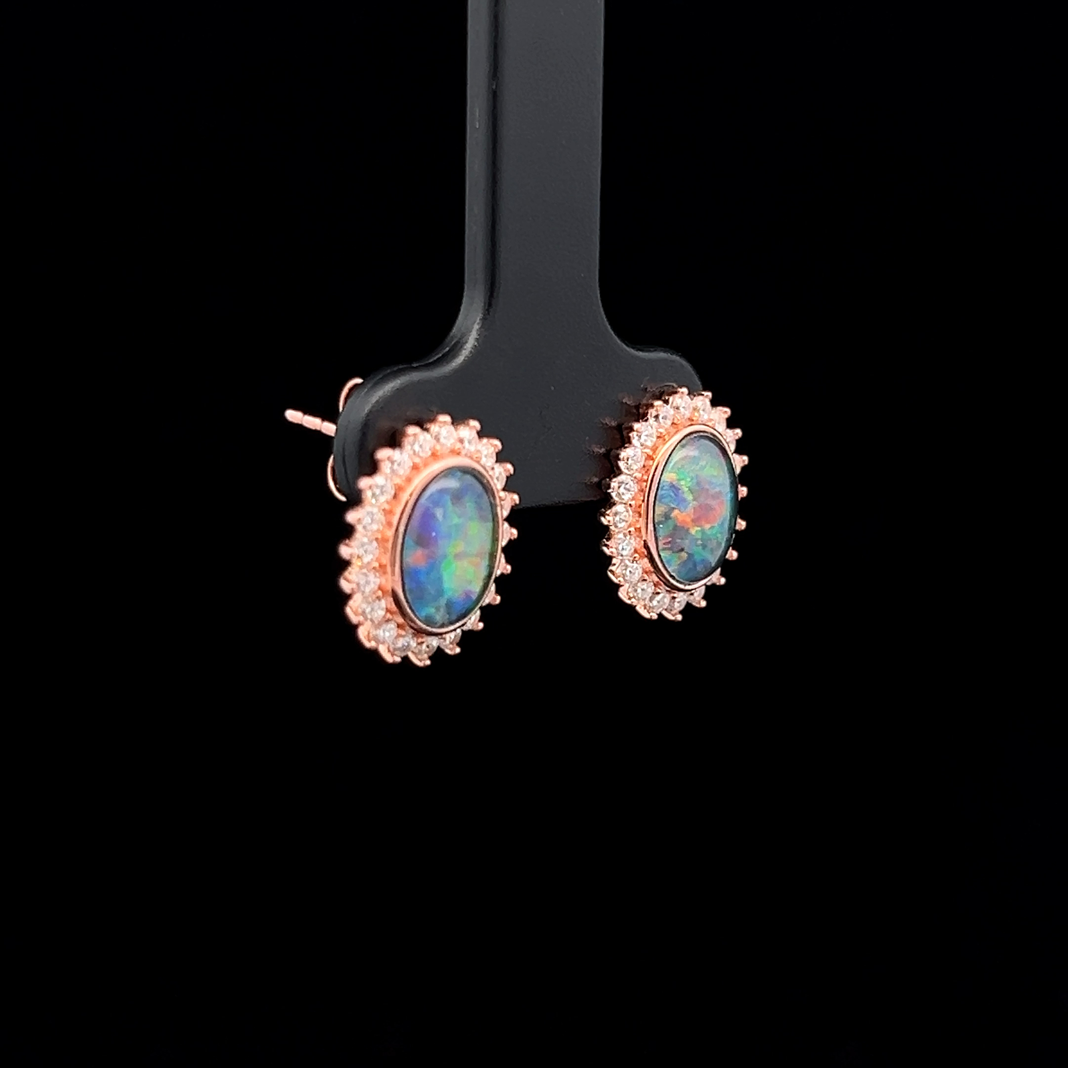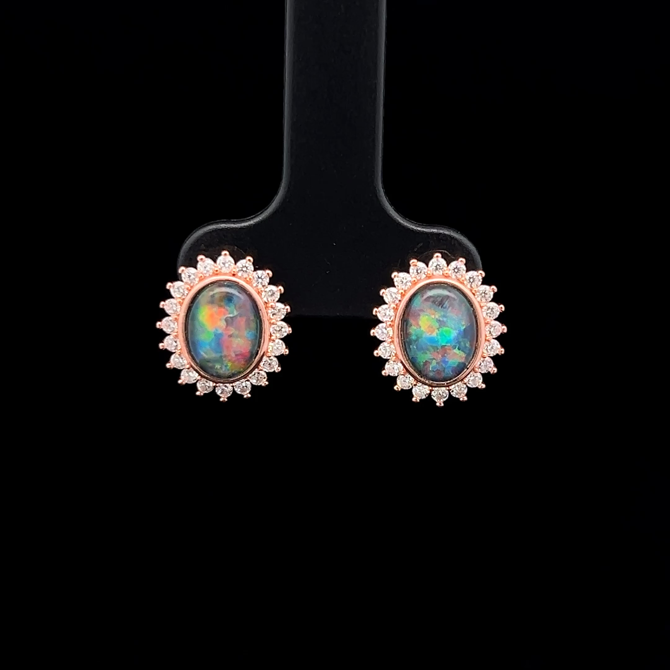 Gem Quality Australian Oval Shaped Triplet Opal Surrounded by Cubic Zirconias set in Rose Gold Plated Sterling Silver Earrings
